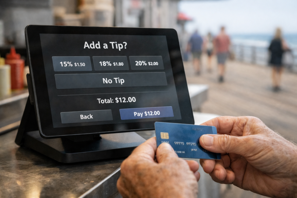 Coney Island tipping can feel confusing, even if you’ve been tipping your whole life. You order a hot dog, you tap your card, and suddenly a screen asks if you want to tip 20%, 25%, or 30%—for someone handing you a tray. If you’re visiting Coney Island, Brighton Beach, and the Brooklyn Boardwalk on a simple day trip, this guide will help you tip with confidence, stay within your budget, and avoid awkward moments.